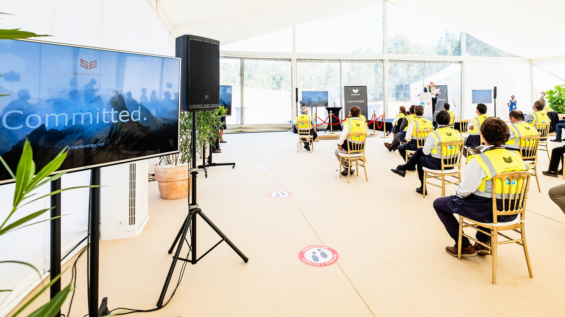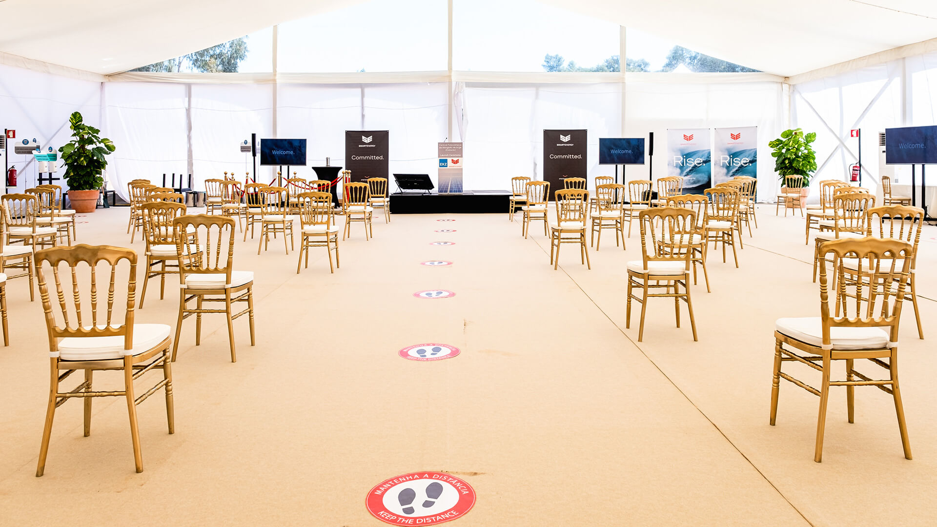 From the dusty grounds of the construction plant, Eventeam built a high-quality marquee of 400 sqm with transparent walls and white ceiling, all-metal elements covered with canvas.The furniture was of high quality, the excellent audiovisual system covered the audio and video needs, and the ambience was extremely pleasant with a 6 powerful air conditioning machines assuring the ideal temperature and the needed hygienic standards with germicidal lamps in the filters.
