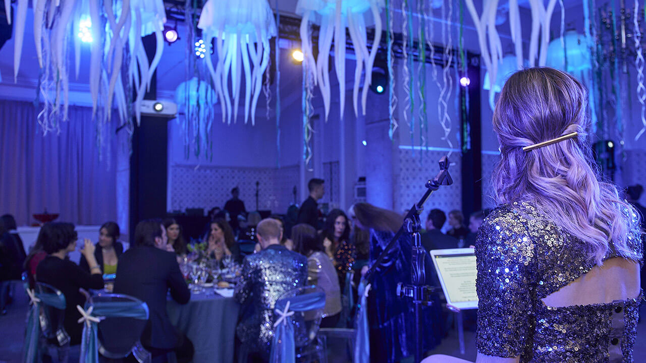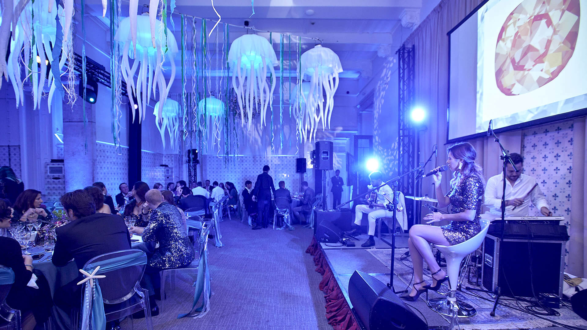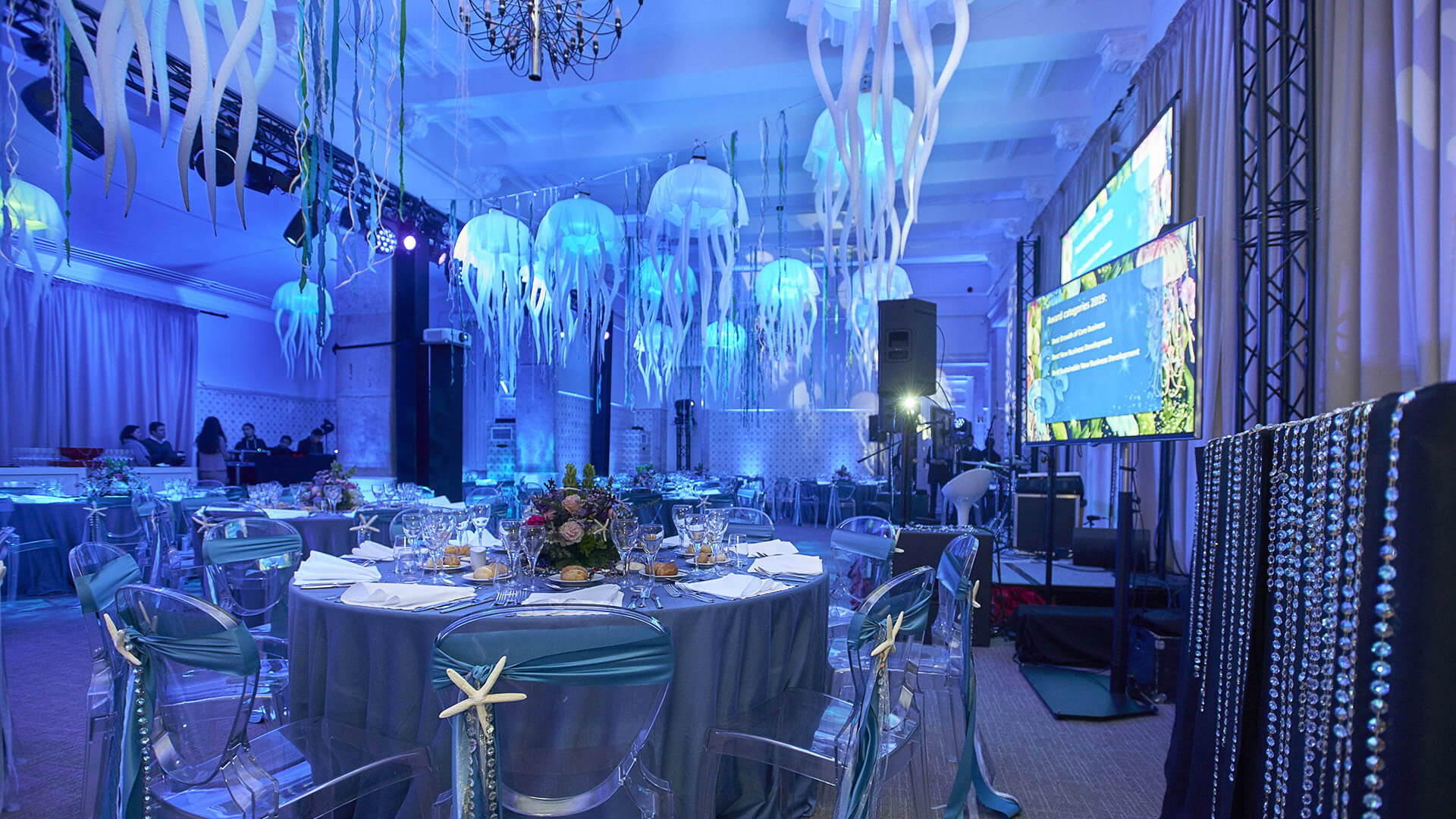 Eventeam included neon decoration mingled with submarine elements such as jellyfish hanging from the ceiling, starfish and shells on the tables and hanging over the chairs. Special lighting created the immersive underwater feeling accompanied by deep-sea sounds. A professional video display and photo coverage together with our special DJ have ensured that the goals of the evening were successfully achieved.
